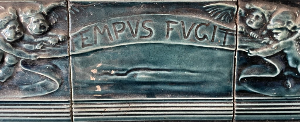 The fireplace in the living room has old tilework around it, which is original to the house. During prior renovations, the line of previous owners thankfully left this unique bit unchanged. At the top center of the tilework are winged cherubs holding a banner that reads, tempus fugit.