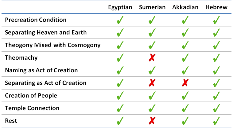 John Walton, Christian scholar from Wheaton University, presented side-by-side comparisons of various ancient near eastern (ANE) creation myths with Genesis in his book “Genesis 1 as Ancient Cosmology” (ref. 57). His tables are quite detailed, listing specific documents from Egyptian, Sumerian, and Akkadian texts (tables 2-1 and 2-2). I have created a condensed version of this information in the two tables below for quick visual comparison. The first compares theological and thematic features, while the second compares the metaphysical elements included.